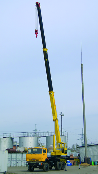 -  Стрела телескопическая трехсекционная. Выдвижение секций - гидроцилиндром и полиспастами. Для увеличения высоты подъема и размера подстрелового пространства кран комплектуется гуськом.