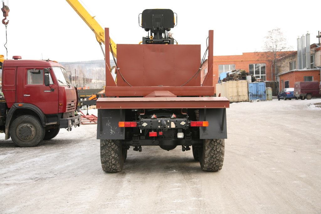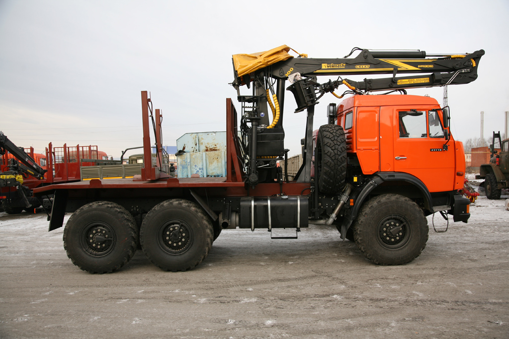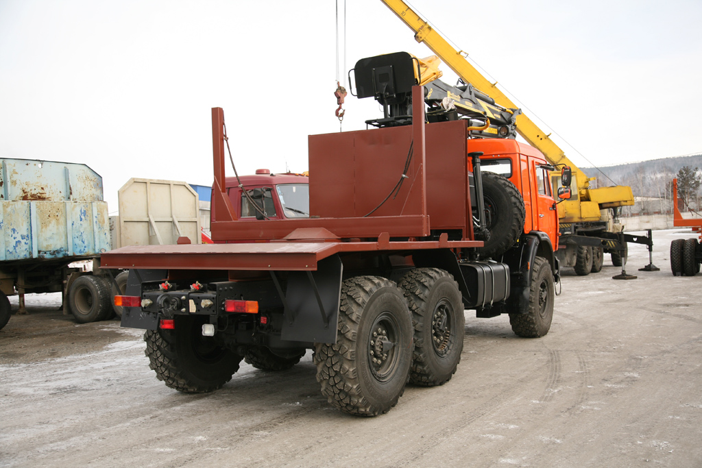 Лесовозный тягач на базе шасси «КамАЗ 43118» с гидроманипулятором ОМТЛ-97 (ПЛ-97) с колёсной формулой 6х6 предназначен для транспортировки лесозаготовок: бревен, сортамента по дорогам общего пользования и бездорожью.