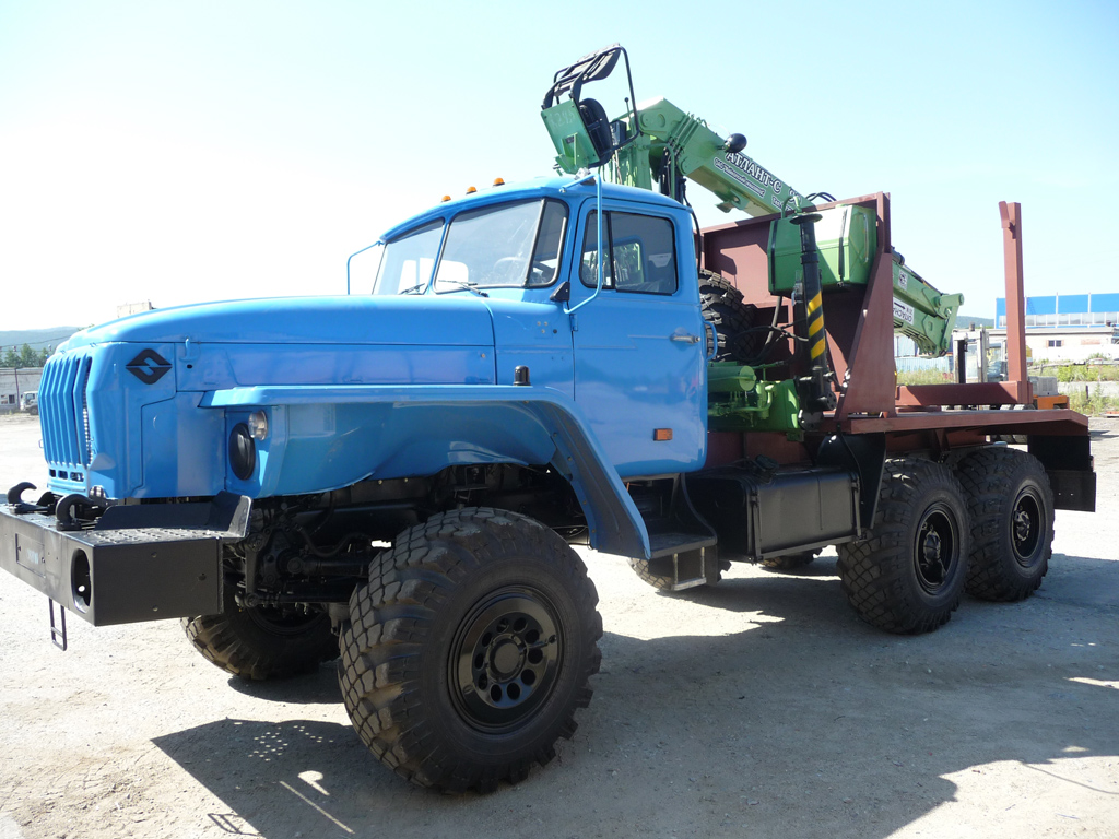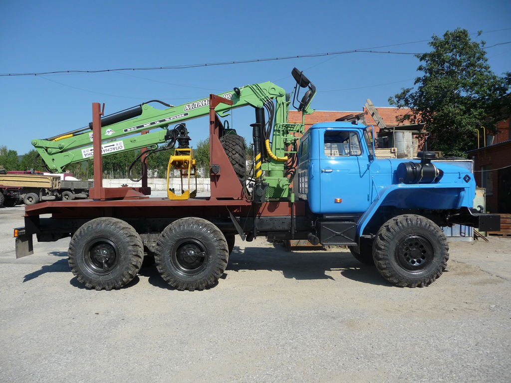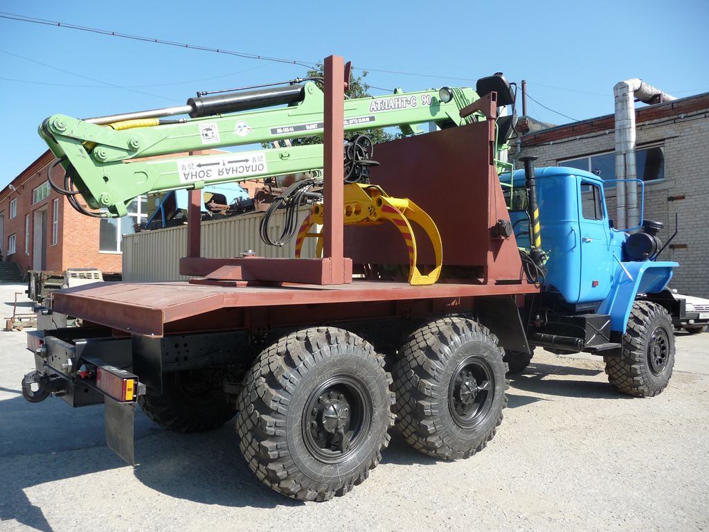 Лесовозный тягач на автомобильном полноприводном шасси с колесной формулой 6х6 «Урал 55571-1151-60М» с гидроманипулятором  Атлант-90 предназначен для транспортировки заготовленного леса, длиной до 23 метров (при условии использования прицепа-роспуска).