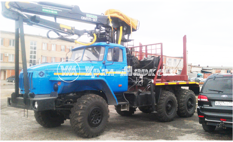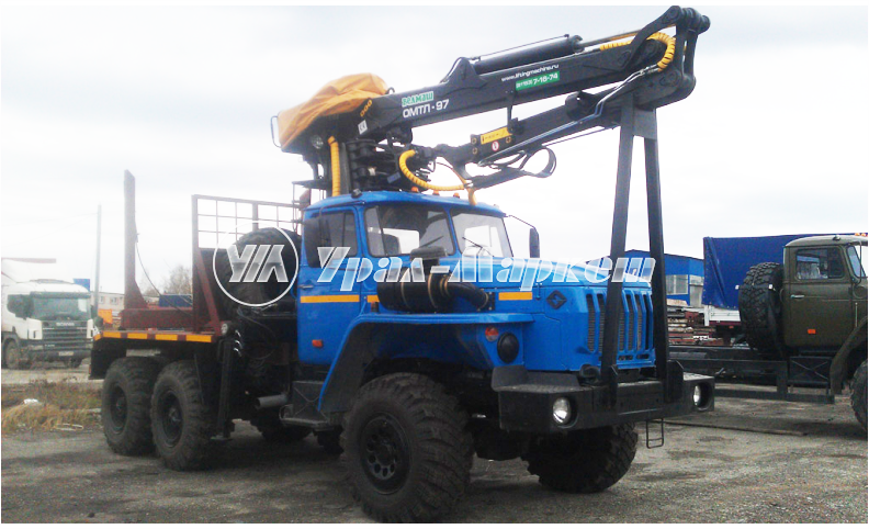 Лесовозный тягач на полноприводном шасси «Урал 55571-1151-60М» с КМУ ОМТЛ-97 (ранее производитель именовал эту крано-манипуляторную установку ПЛ-97) предназначен для транспортировки заготовок леса, длина которых может достигать 23 метров в длину (при этом использование прицепа-роспуска обязательно).