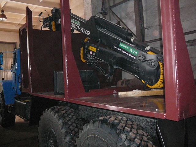 Сортиментовозный тягач на высокопроходимом автошасси «Урал 4320-1912-60М» с гидроманипулятором,  служит для перевозки сортиментов длиной до 6 метров по любым типам дорог.