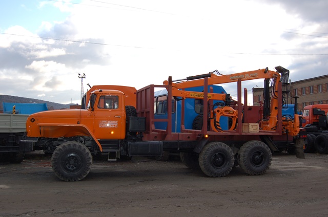 ортиментовозный тягач на высокопроходимом автошасси «Урал 4320-1912-60М» с гидроманипулятором,  служит для перевозки сортиментов длиной до 6 метров по любым типам дорог.