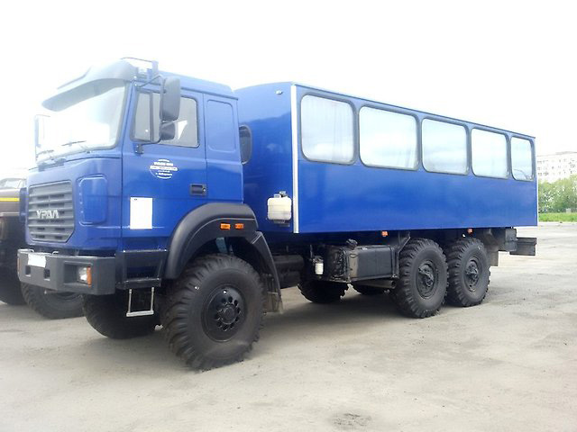 Вахтовый автобус  Урал 3255-3013-79 с двигателем ЕВРО-4 предназначен для перевозки пассажиров по всем видам дорог и отдельным участкам местности. Салон кузова-фургона с низким полом